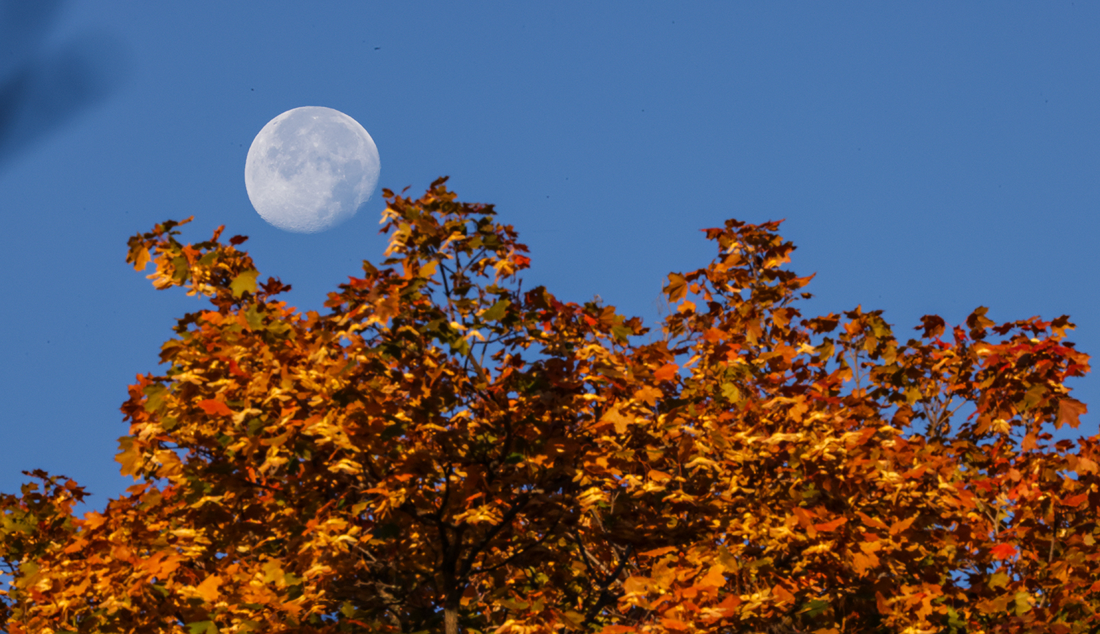 The moon appears over the leafy orange crown of a tree in Kalispell on Oct. 9, 2025. Hunter D’Antuono | Flathead Beacon