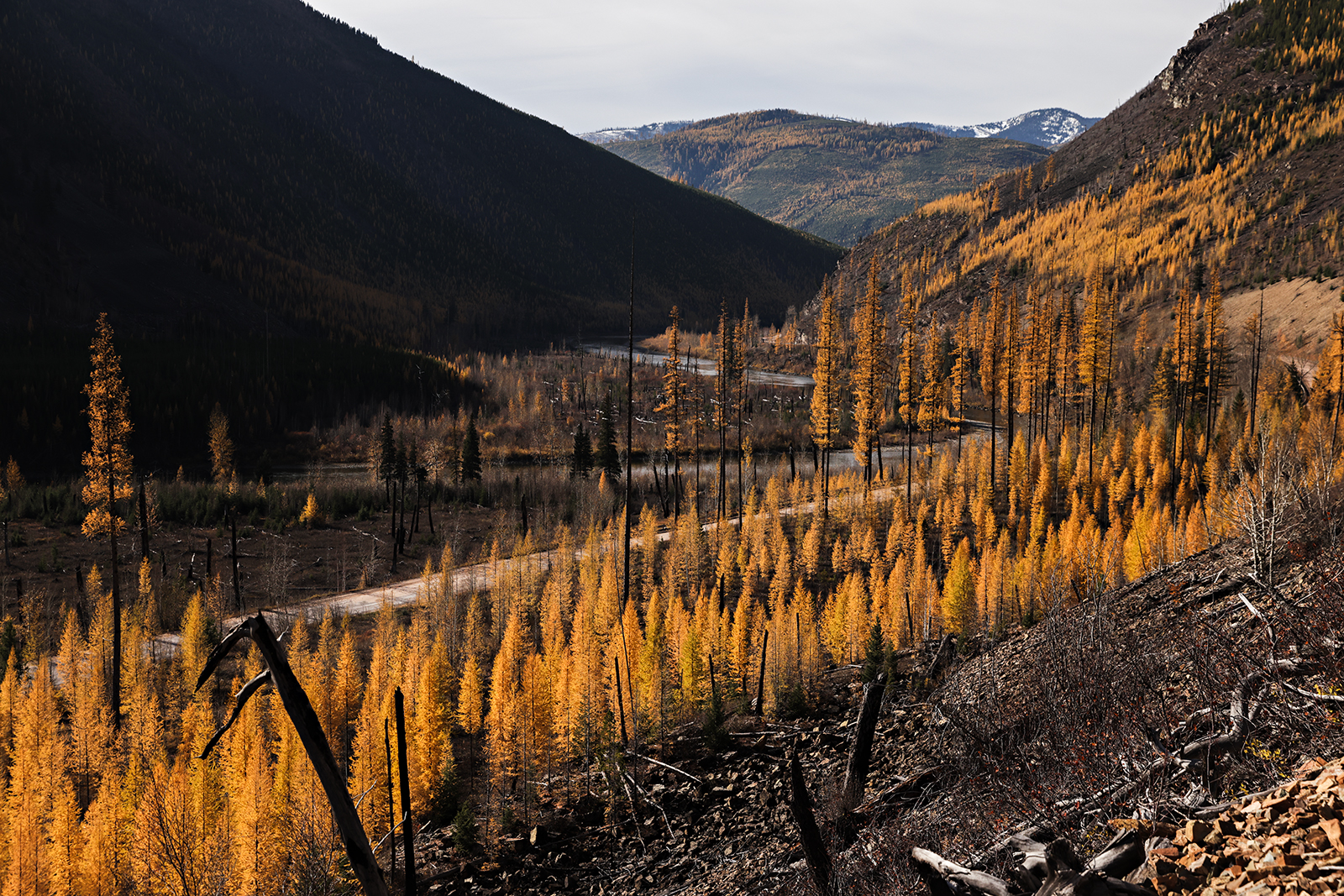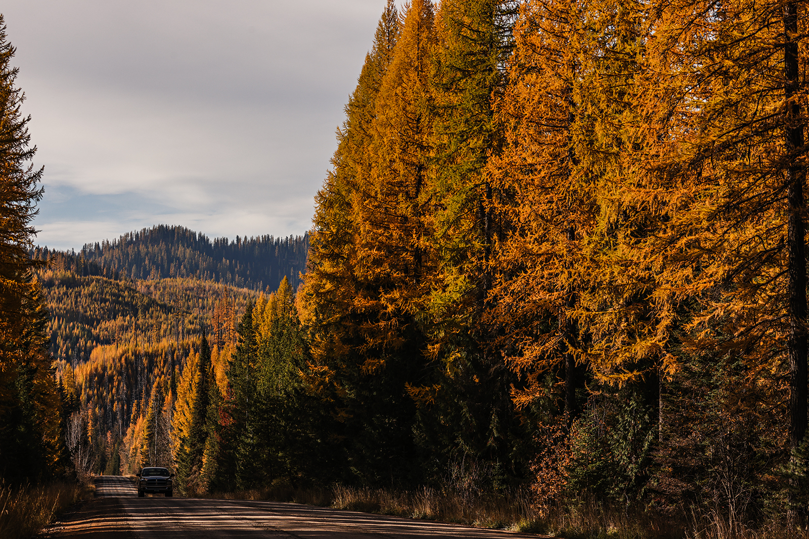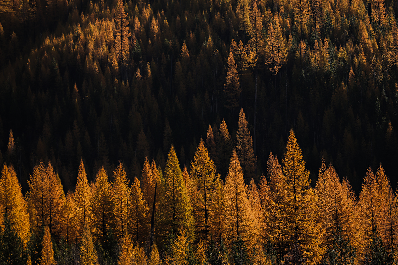 Stands of golden larch along the North Fork Road on Oct. 24, 2025. Hunter D’Antuono | Flathead Beacon