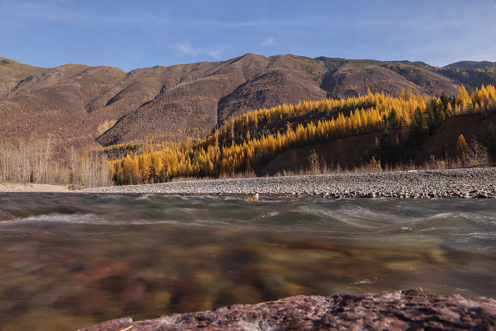 Stands of autumnal larch over the North Fork of the Flathead River on Oct. 24, 2025. Hunter D’Antuono | Flathead Beacon
