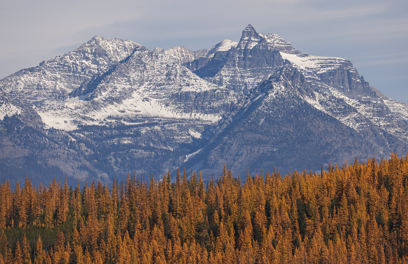 Peaks in Glacier National Park tower over stands of larch in the North Fork on Oct. 24, 2025. Hunter D’Antuono | Flathead Beacon