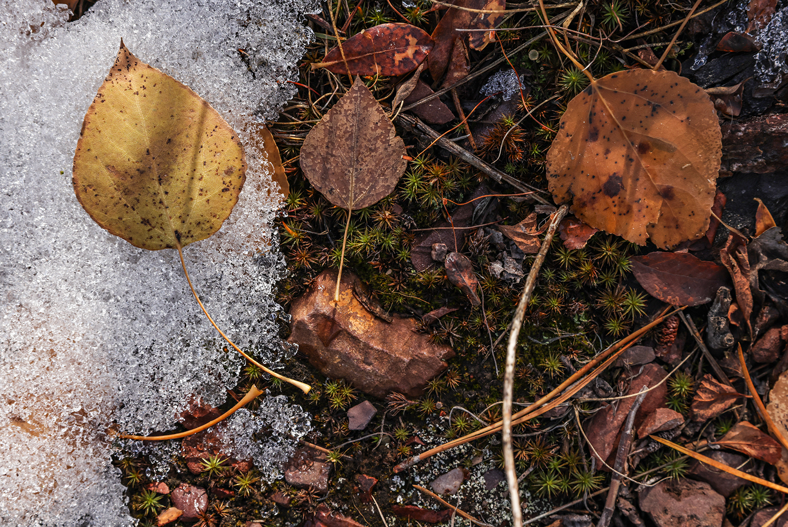 Autumn leaves and patches of snow along Demers Ridge in the North Fork on Oct. 24, 2025. Hunter D’Antuono | Flathead Beacon