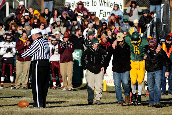 Luke May is helped off the field after an injury. Butte Central beat Whitefish 37-13 in the Class A semifinal game in Whitefish on Nov. 14, 2014. Greg Lindstrom | Flathead Beacon