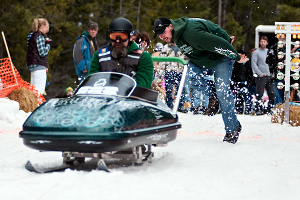 Tyson Derber pushes Mark McConnaughey, riding for team Boozefighters, at the 37th annual Cabin Fever Days in Martin City on Feb. 14, 2015. Greg Lindstrom | Flathead Beacon