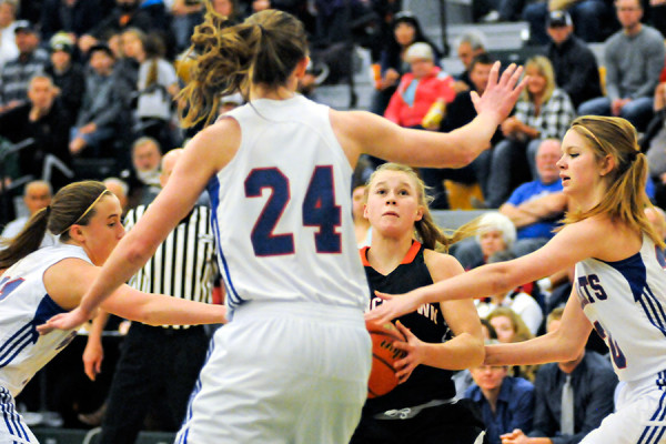 Columbia Falls defenders swarm the Lady Broncs. Columbia Falls defeated Frenchtown 53-43 to win their second consecutive Northwestern A divisional title on Feb. 28, 2015. More photos at flatheadbeacon.com. Greg Lindstrom | Flathead Beacon