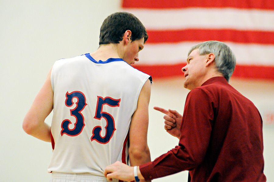Cary Finberg gives instructions to Grant Wallace. Columbia Falls defeated Polson 62-48 to win its seventh consecutive Northwestern A divisional title on Feb. 28, 2015. More photos at flatheadbeacon.com. Greg Lindstrom | Flathead Beacon