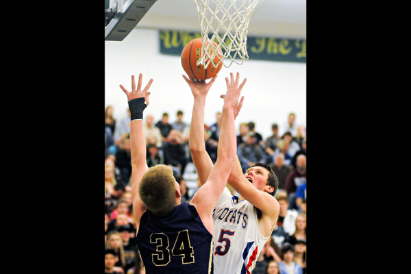 Grant Wallace shoots over Matthew Rensvold. Columbia Falls defeated Polson 62-48 to win its seventh consecutive Northwestern A divisional title on Feb. 28, 2015. More photos at flatheadbeacon.com. Greg Lindstrom | Flathead Beacon