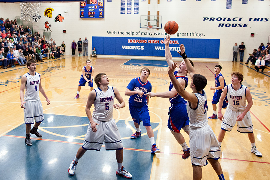 Grant Wallace reaches for a rebound over Jonathan Landon (14). Columbia Falls beat Bigfork 64-43 on Jan. 8, 2015. Greg Lindstrom | Flathead Beacon