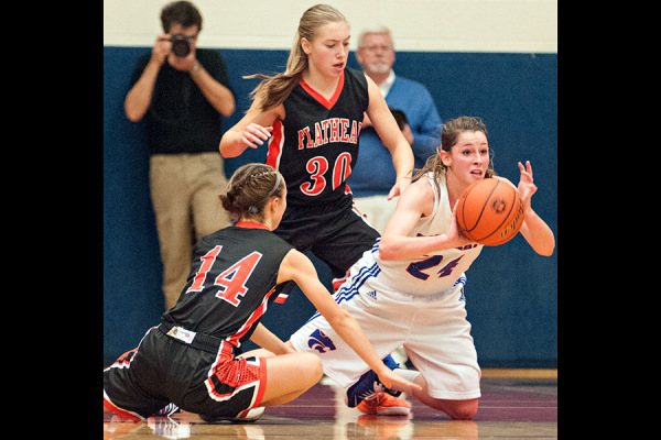 Winter Kemppainen (24) secures a loose ball. Columbia Falls beat Flathead 50-37 on Dec. 11, 2014. For more photos visit www.FlatheadBeacon.com. Greg Lindstrom | Flathead Beacon