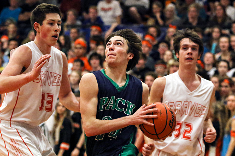 Glacier's Brec Rademacher drives to the basket during a crosstown game at Flathead High School, Feb. 1, 2018. Greg Lindstrom | Flathead Beacon