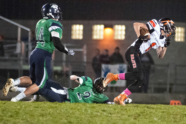 Keaton Krantz breaks free from Glacier defenders during the crosstown game at Legends Stadium on Oct. 31, 2014. Glacier beat Flathead 27-7. Greg Lindstrom | Flathead Beacon