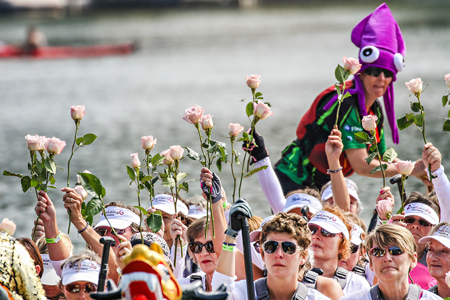 Pink roses are distributed to members of Silver Lining paddling team from Missoula, who are all survivors of breast cancer, for a ceremony during the Montana Dragon Boat Festival in Bigfork Bay in Bigfork on Sept. 7, 2019. Hunter D’Antuono | Flathead Beacon