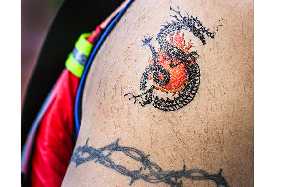 Patrick Gembala and his team, Fa'assaulala, sported matching temporary dragon tattoos for the the Montana Dragon Boat Festival in Bigfork Bay in Bigfork on Sept. 7, 2019. Hunter D’Antuono | Flathead Beacon