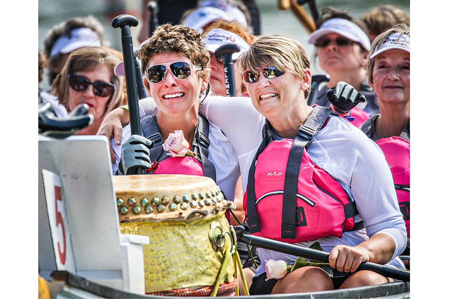 Tricia Lingle Johnson, left, of Missoula and Heidi Call of Kalispell share a tearful moment during a ceremony for breast cancer survivors and patients during the Montana Dragon Boat Festival in Bigfork Bay in Bigfork on Sept. 7, 2019. Lingle and Call received their diagnoses on Oct 16, 2018 and Oct 23, 2018, respectively. Hunter D’Antuono | Flathead Beacon