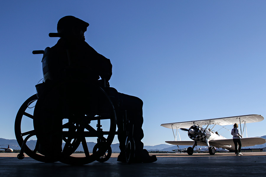 Len Derby, a resident of The Springs at Whitefish, watches fellow resident Jack Taylor as he prepares for a flight in a 1942 Boeing Stearman with pilot Mike Winterboer, a volunteer with Ageless Aviation Dreams Foundation, at the Glacier Jet Center on July 18, 2016. Greg Lindstrom | Flathead Beacon
