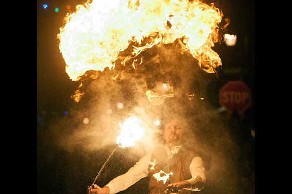 Greg Koniges spits lamp oil to create a large burst of flame during the performance at the Whitefish Christmas Stroll on Dec. 12, 2014. Greg Lindstrom | Flathead Beacon