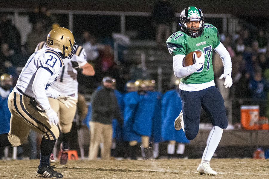 Glacier’s Jacob Janke breaks away from Big Sky defenders for a touchdown in the second half. Glacier beat Missoula Big Sky 42-8 in the Class AA semifinal game at Legends Stadium on Nov. 14, 2014. Greg Lindstrom | Flathead Beacon