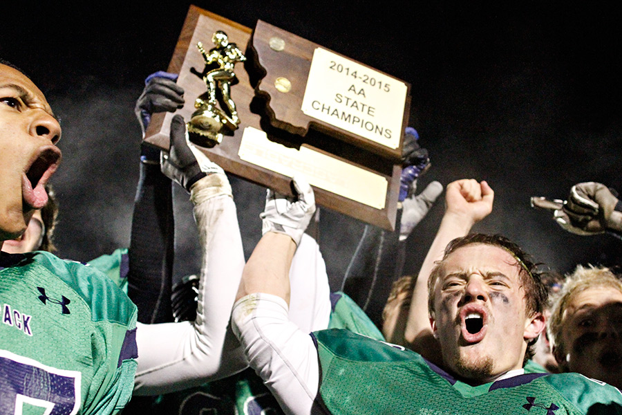 Logan Jones, center, and Jacob Janke, left, celebrate with the trophy. Kalispell Glacier defeated Great Falls CMR 56-19 in the Class AA state championship game on Nov. 21, 2014. For more photos visit www.FlatheadBeacon.com. Greg Lindstrom | Flathead Beacon