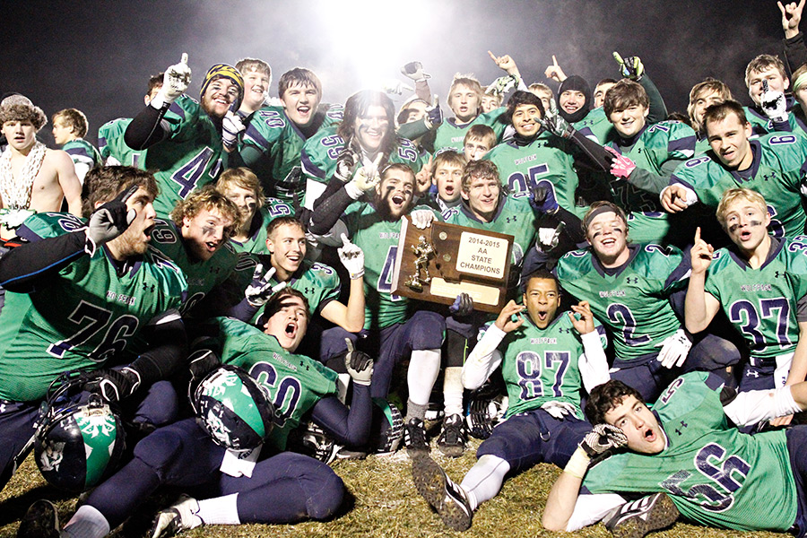 Glacier players celebrate with the trophy after the game. Kalispell Glacier defeated Great Falls CMR 56-19 in the Class AA state championship game on Nov. 21, 2014. For more photos visit www.FlatheadBeacon.com. Greg Lindstrom | Flathead Beacon
