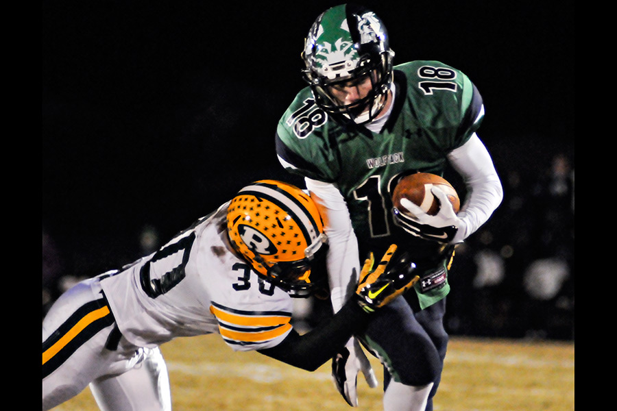 Sam McCamley (18) tries to get past Evan O'Neill (30). Kalispell Glacier defeated Great Falls CMR 56-19 in the Class AA state championship game on Nov. 21, 2014. For more photos visit www.FlatheadBeacon.com. Greg Lindstrom | Flathead Beacon