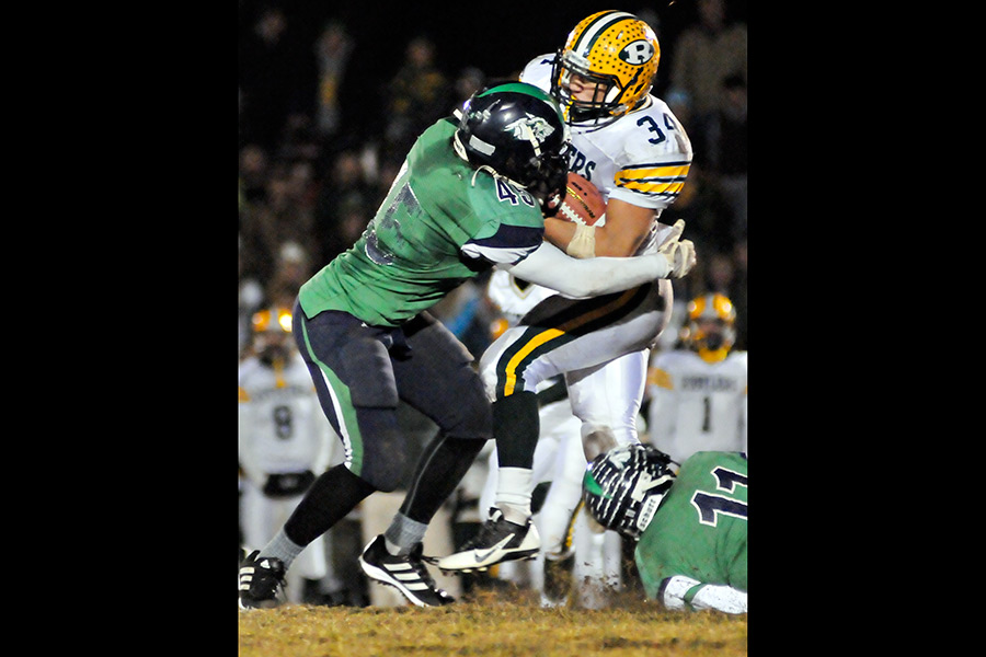 Josh Hill (45) brings down Andrew Grinde. Kalispell Glacier defeated Great Falls CMR 56-19 in the Class AA state championship game on Nov. 21, 2014. For more photos visit www.FlatheadBeacon.com. Greg Lindstrom | Flathead Beacon