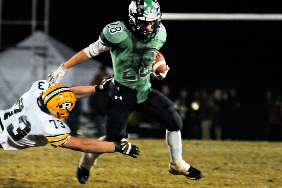 Logan Jones (28) runs past Ryan Millhollin (73). Kalispell Glacier defeated Great Falls CMR 56-19 in the Class AA state championship game on Nov. 21, 2014. For more photos visit www.FlatheadBeacon.com. Greg Lindstrom | Flathead Beacon