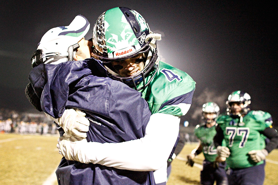 Arik Lybeck leaps into the arms of head coach Grady Bennett. Kalispell Glacier defeated Great Falls CMR 56-19 in the Class AA state championship game on Nov. 21, 2014. For more photos visit www.FlatheadBeacon.com. Greg Lindstrom | Flathead Beacon