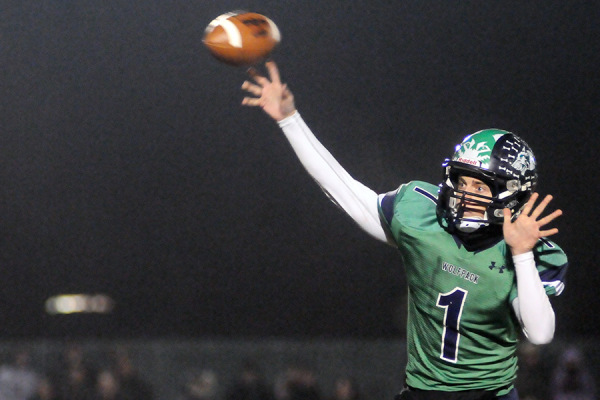 Senior quarterback Brady McChesney makes a pass in the first half. Kalispell Glacier defeated Great Falls CMR 56-19 in the Class AA state championship game on Nov. 21, 2014. For more photos visit www.FlatheadBeacon.com. Greg Lindstrom | Flathead Beacon