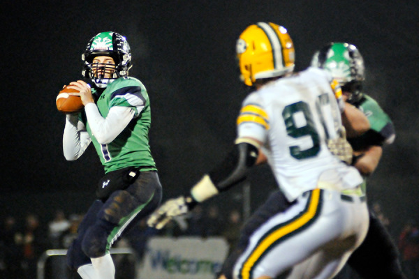 Brady McChesney looks for an open receiver. Kalispell Glacier defeated Great Falls CMR 56-19 in the Class AA state championship game on Nov. 21, 2014. For more photos visit www.FlatheadBeacon.com. Greg Lindstrom | Flathead Beacon