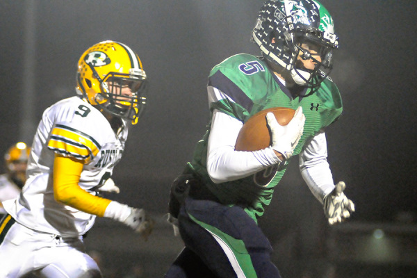 Devin Cochran breaks away from CMR defenders. Kalispell Glacier defeated Great Falls CMR 56-19 in the Class AA state championship game on Nov. 21, 2014. For more photos visit www.FlatheadBeacon.com. Greg Lindstrom | Flathead Beacon
