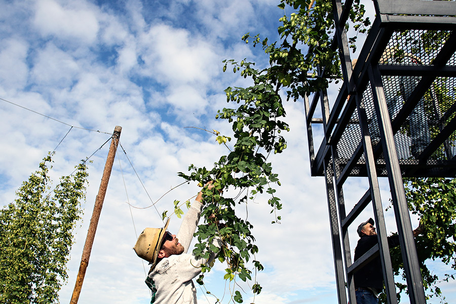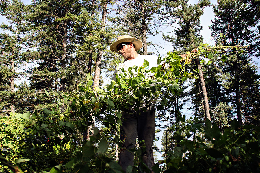 Elliot Stephens separates hop bines before feeding them through a machine, nicknamed Hildegaard, that strips the hop cones from the bines at Glacier Hops Ranch on Sept. 9, 2015. Greg Lindstrom | Flathead Beacon
