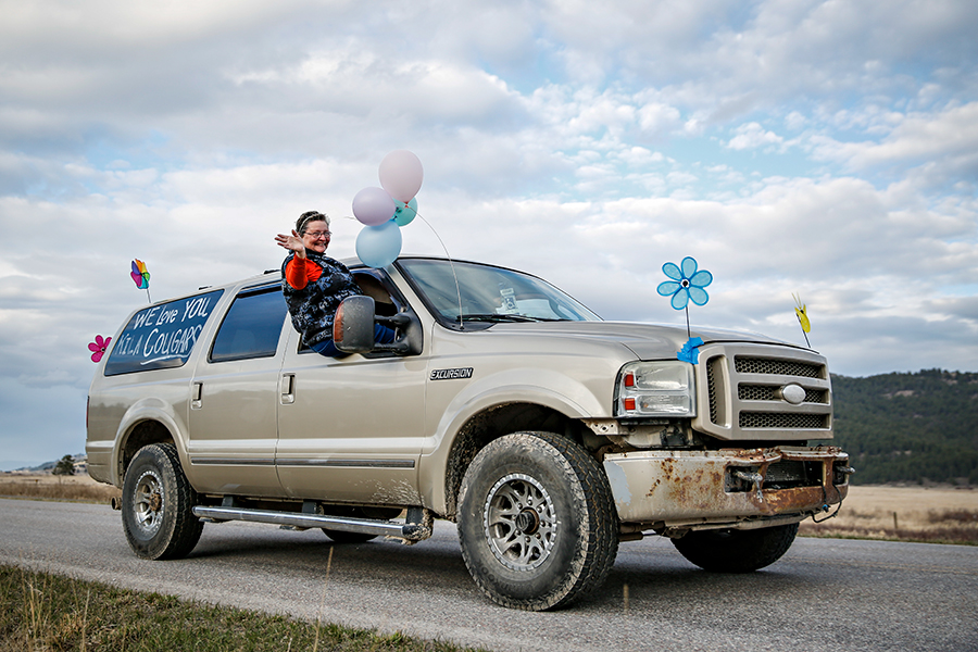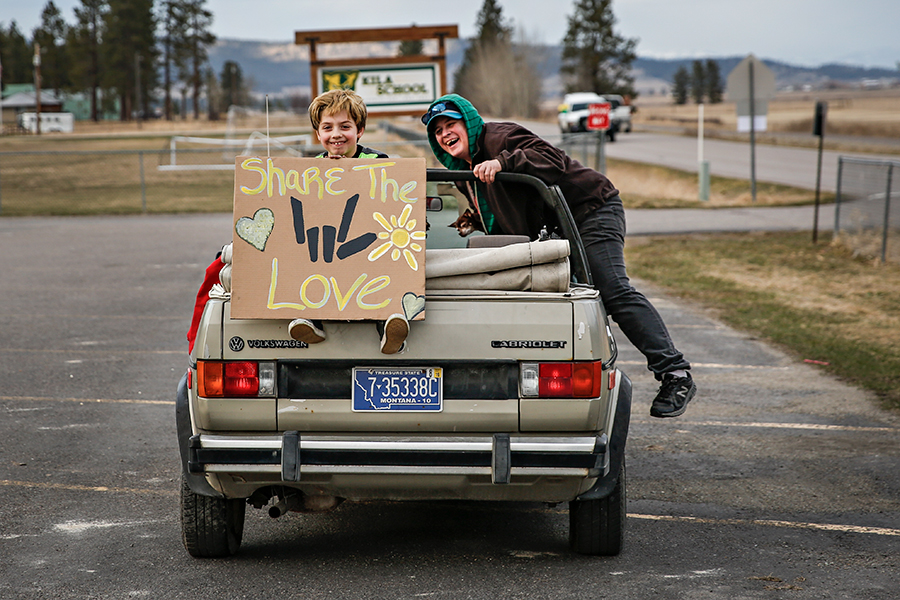 Memphis Ballares holds a sign reading “Share the Love” as Becky Spencer climbs into the back of an old Volkswagen convertible after giving it a push to get it started on April 10, 2020. Kila School students, teachers and other community residents participated in physically-distant car parade as a way to connect during the COVID-19 outbreak. Hunter D’Antuono | Flathead Beacon