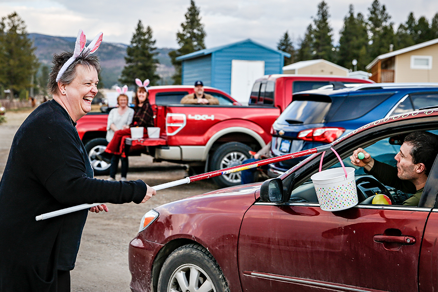 Julie Early, a fifth-grade teacher at Kila School, hands out Easter eggs with a bucket attached to the end of a broom handle during a physically-distant car parade through Kila on April 10, 2020. Kila School students, teachers and other community residents participated in the parade as a way to connect during the COVID-19 outbreak. Hunter D’Antuono | Flathead Beacon