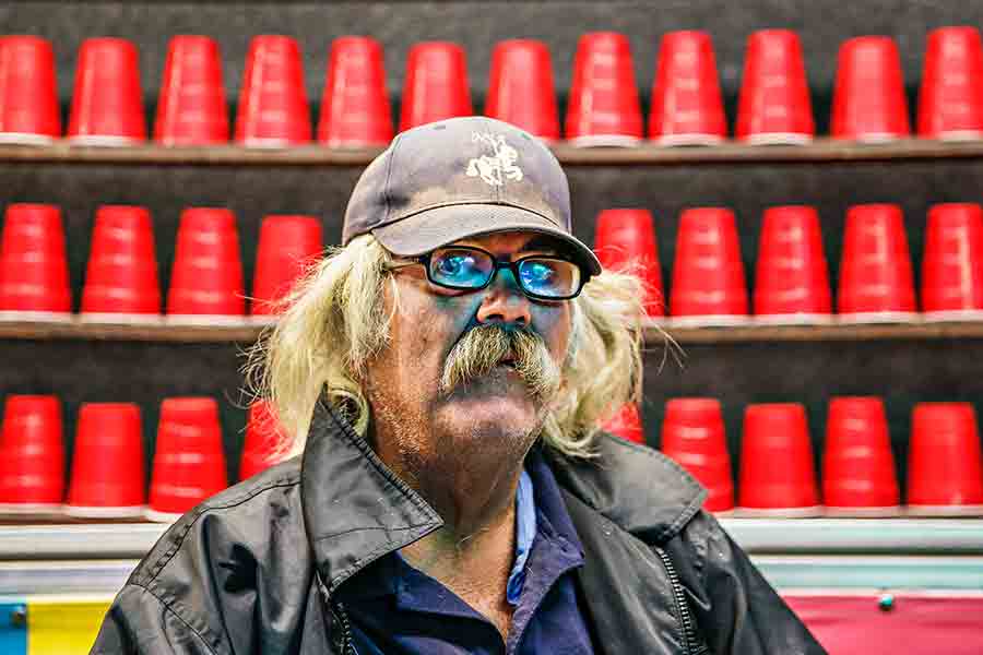 Scotty Gregory, 58, a carnival worker for North Star Amusements, mans a booth at the Northwest Montana Fair in Kalispell on August 16, 2019. He plans to retire next year after working in the carnival business since he was 10 years old. His dream is to establish an organic community farm in Kentucky with the $2.4 million settlement he received after a botched surgery in which of all of his toes were removed. “That’s why I sit in a chair and most people don’t,” he said, gesturing to his standing coworkers. Hunter D’Antuono | Flathead Beacon
