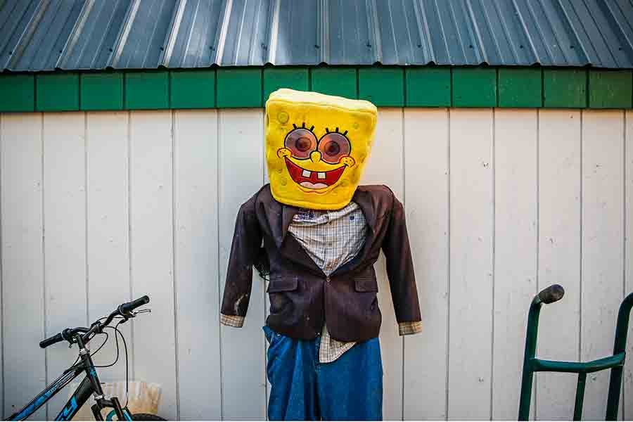 The rodeo clown’s SpongeBob SquarePants “scarecrow” leans against a wall outside the rodeo arena at the Northwest Montana Fair in Kalispell on August 17, 2019. Hunter D’Antuono | Flathead Beacon