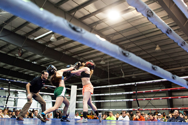 Kari Inabnit, left, and Caitlin Morrison compete in the high school boxing smoker at the Flathead County Fairgrounds on April 16, 2015. Greg Lindstrom | Flathead Beacon