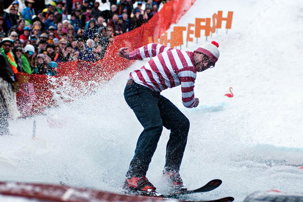 Mark Ruby tries to keep his balance during the 10th annual pond skim competition at Whitefish Mountain Resort on April 11, 2015. Greg Lindstrom | Flathead Beacon