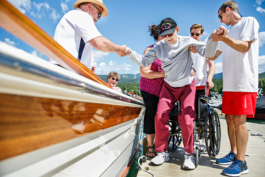 Bill Bone, a resident of the Columbia Falls Montana Veterans Home, is helped onto The Lady of the Lake at The Lodge at Whitefish Lake on June 14, 2019. The veterans were treated to an afternoon boat cruise on Whitefish Lake on June 14, 2019. Hunter D’Antuono | Flathead Beacon
