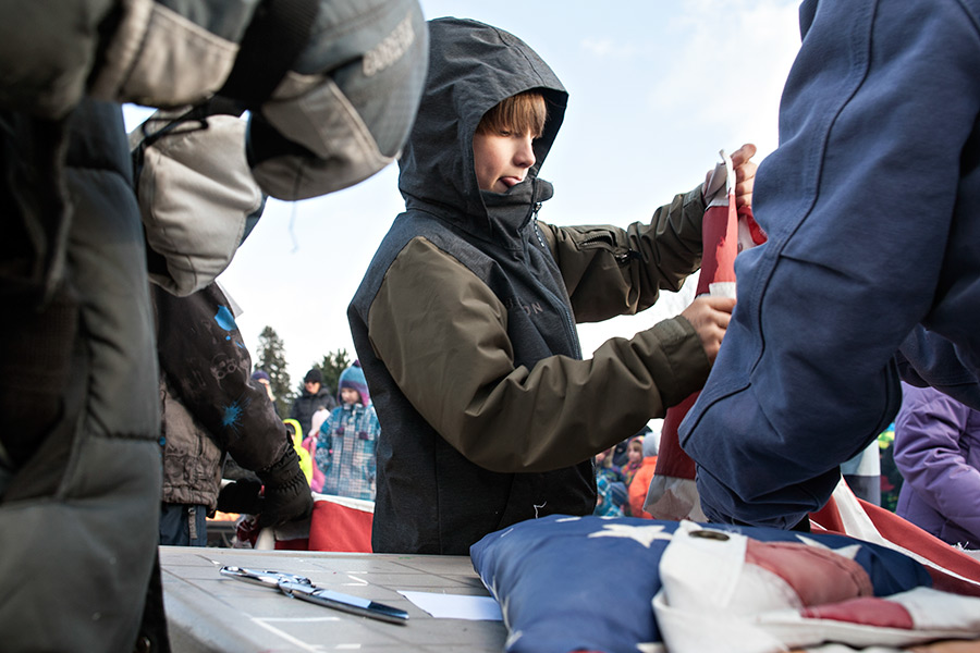 Fourth-grader Birney Grantz unfolds a flag at Whitefish Christian Academy during a flag retirement ceremony on Nov. 11, 2014. Greg Lindstrom | Flathead Beacon