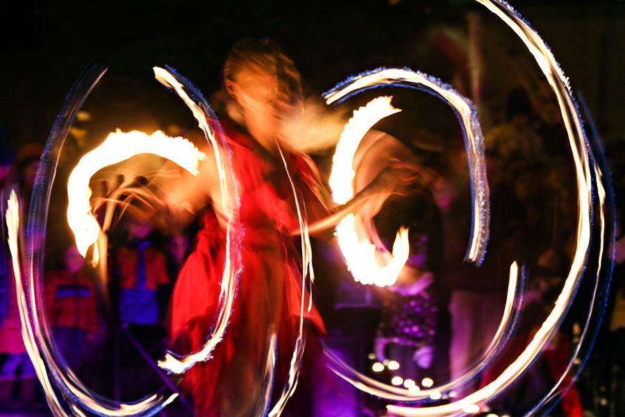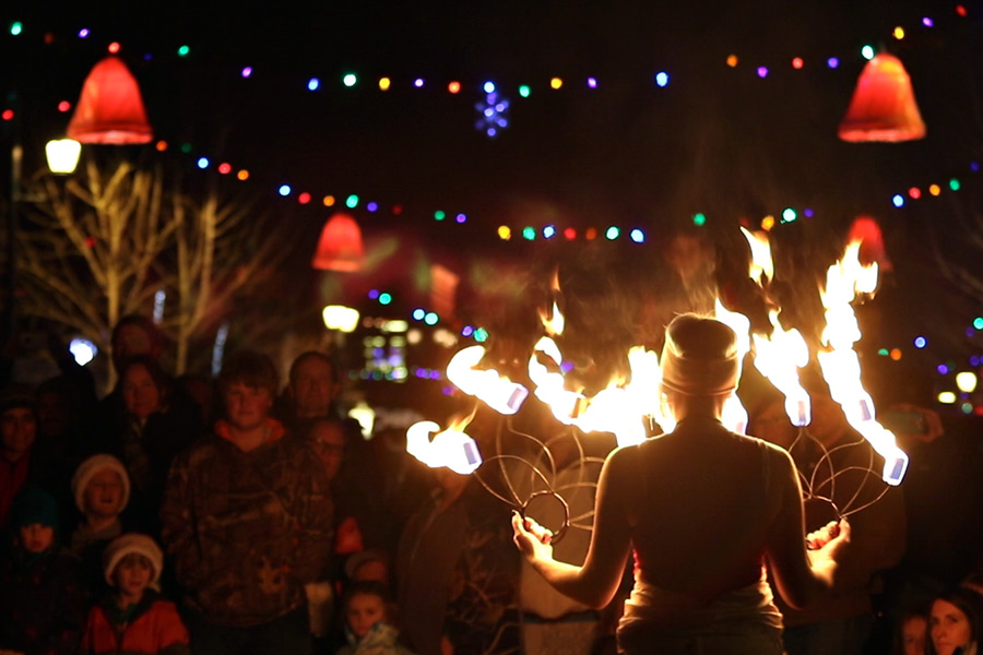 The fire-spinning troupe, Whitefire, performs at the Whitefish Christmas Stroll.