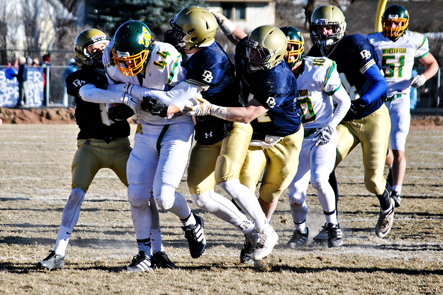 Jed Nagler is surrounded by Dillon defenders. The Whitefish Bulldogs defeated the Dillon Beavers 17-13 on Saturday to win the Class A football state championship on Nov. 22, 2015. Courtesy JP Plutt | Dillon Tribune