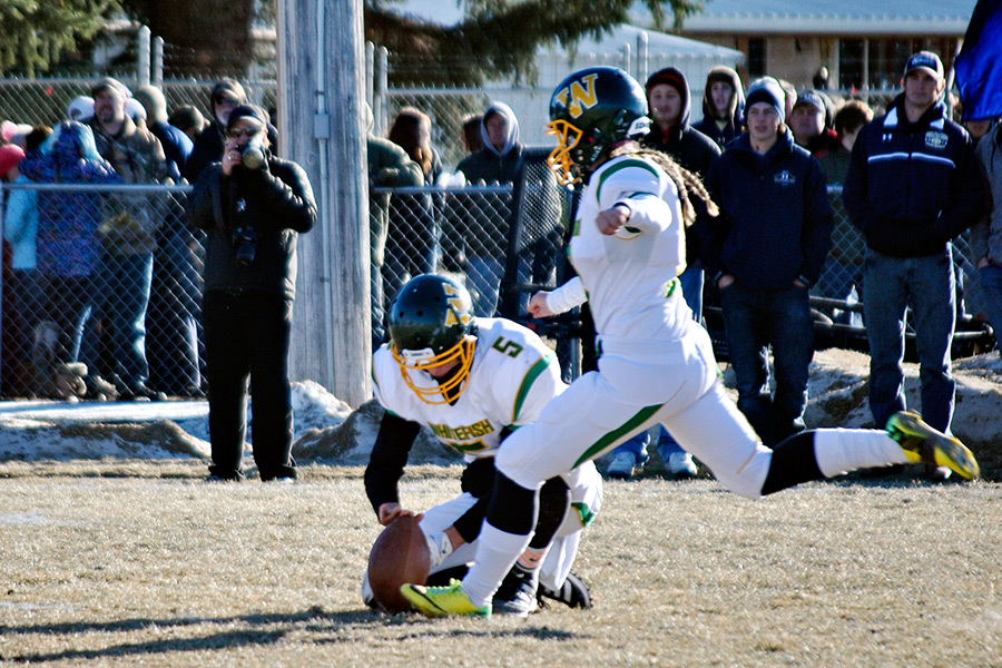 Haley Nicholson kicks a field goal. The Whitefish Bulldogs defeated the Dillon Beavers 17-13 on Saturday to win the Class A football state championship on Nov. 22, 2015. Courtesy JP Plutt | Dillon Tribune