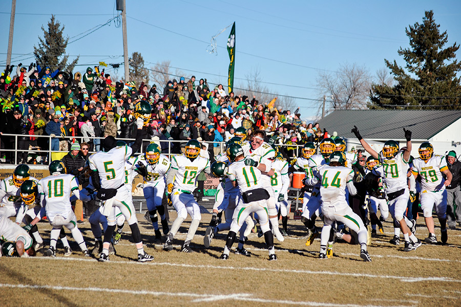 Whitefish players and fans celebrate near the end of the game. The Whitefish Bulldogs defeated the Dillon Beavers 17-13 on Saturday to win the Class A football state championship on Nov. 22, 2015. Courtesy JP Plutt | Dillon Tribune