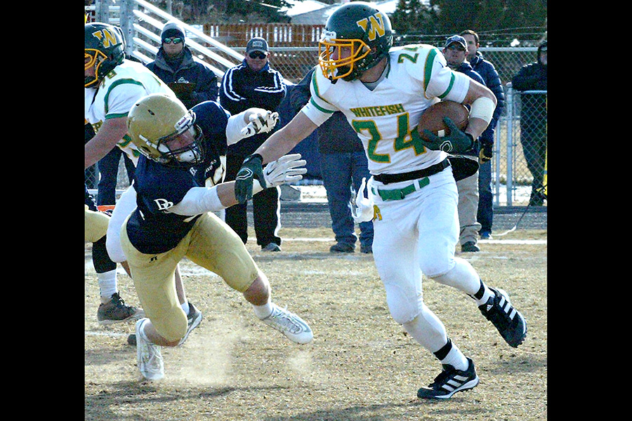 Whitefish running back Brian FauntLeRoy brushes off a Dillon defender during the first quarter of Saturday's State Class A Championship game at Vigilante Stadium. Courtesy Al Balderas | Montana Standard