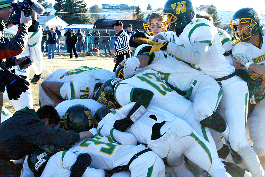 Whitefish football players start their championship celebration by piling up on each other after beating Dillon, 17-13, to capture the State Class A title, Saturday at Vigilante Stadium. Courtesy Al Balderas | Montana Standard
