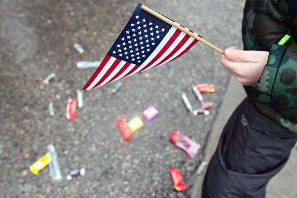 Gordon Baker, 6, holds a flag while grabbing candy off the street at the Whitefish Winter Carnival’s Grand Parade on Feb. 7, 2015. Greg Lindstrom | Flathead Beacon