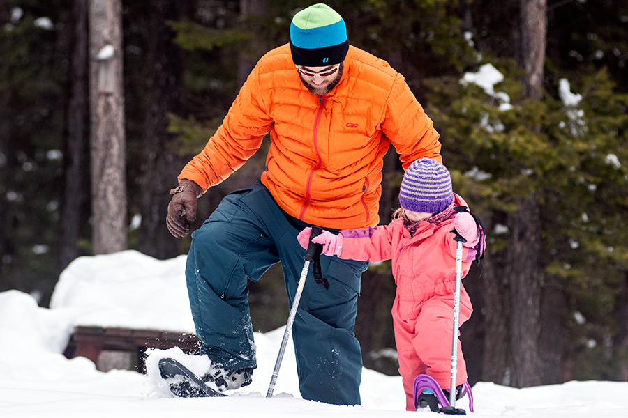 David Downing helps his daughter Lucy, 3, walk in snowshoes during the winter trails day event at Stillwater Nordic Center west of Whitefish on Jan. 10, 2015. Greg Lindstrom | Flathead Beacon