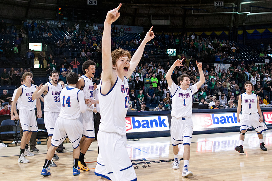 Josh Sandry, center, celebrates with teammates after the game. Bigfork beat Columbus 71-62 on Saturday, March 15, 2014, to win the Class B state championship at the Brick Breeden Fieldhouse in Bozeman. For more photos visit www.FlatheadBeacon.com. Greg Lindstrom | Flathead Beacon