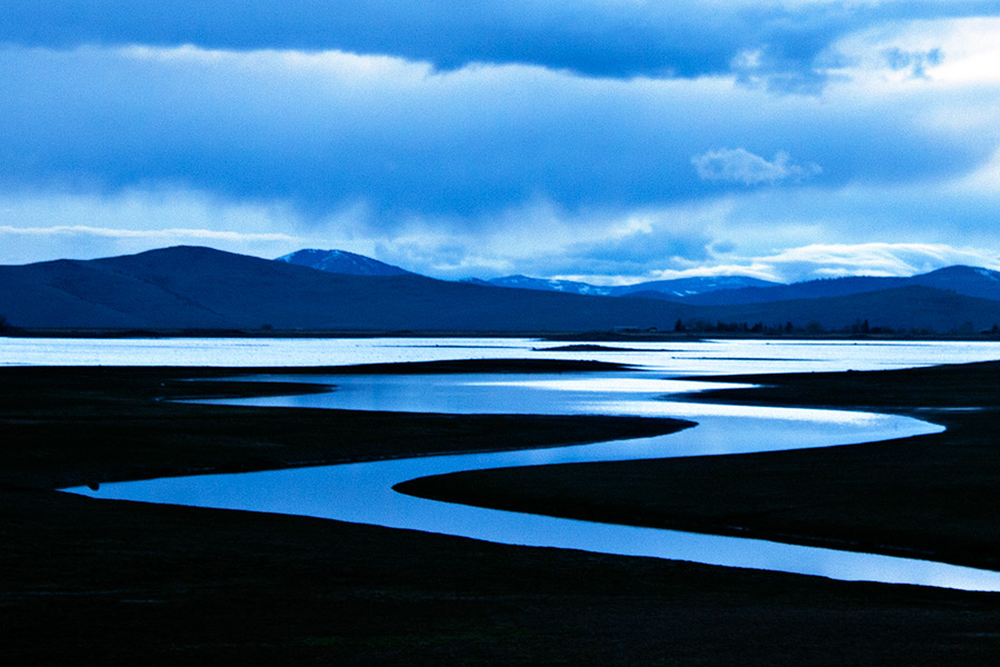 Water meanders out of Ninepipe Reservoir as the sun sets after a passing spring storm on Sunday, March 30, 2014. Greg Lindstrom | Flathead Beacon