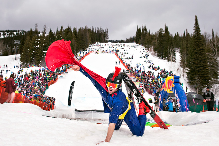 Barton Slaney celebrates a successful run during the ninth annual pond skim competition at Whitefish Mountain Resort on Saturday, April 5, 2014. Greg Lindstrom | Flathead Beacon