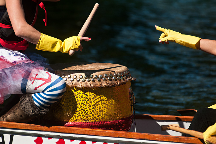 Members of the Riveting Rosies call out directions after their heat during the third annual Montana Dragon Boat Festival at Flathead Lake Lodge on Sept. 13, 2014. Greg Lindstrom | Flathead Beacon